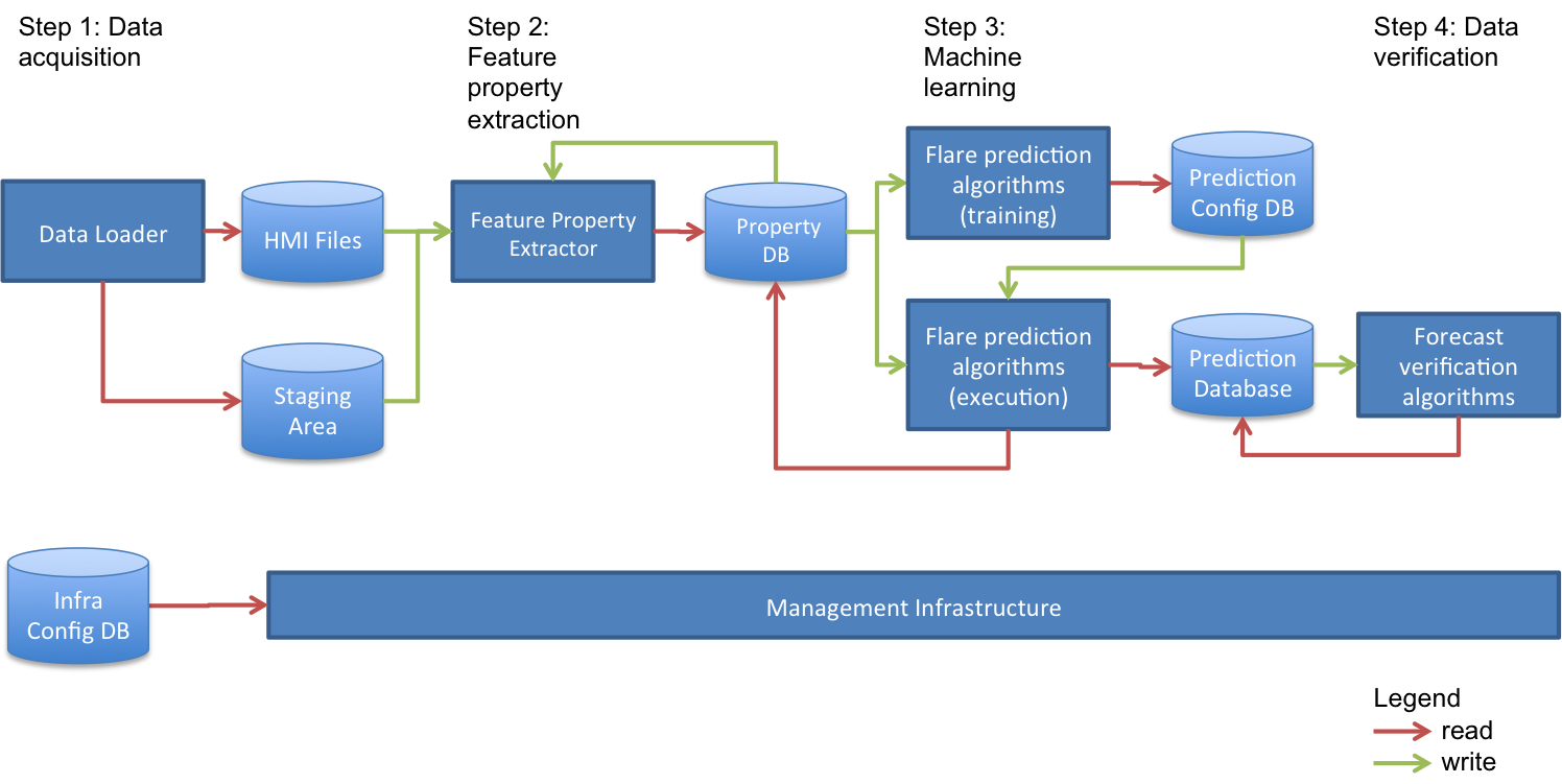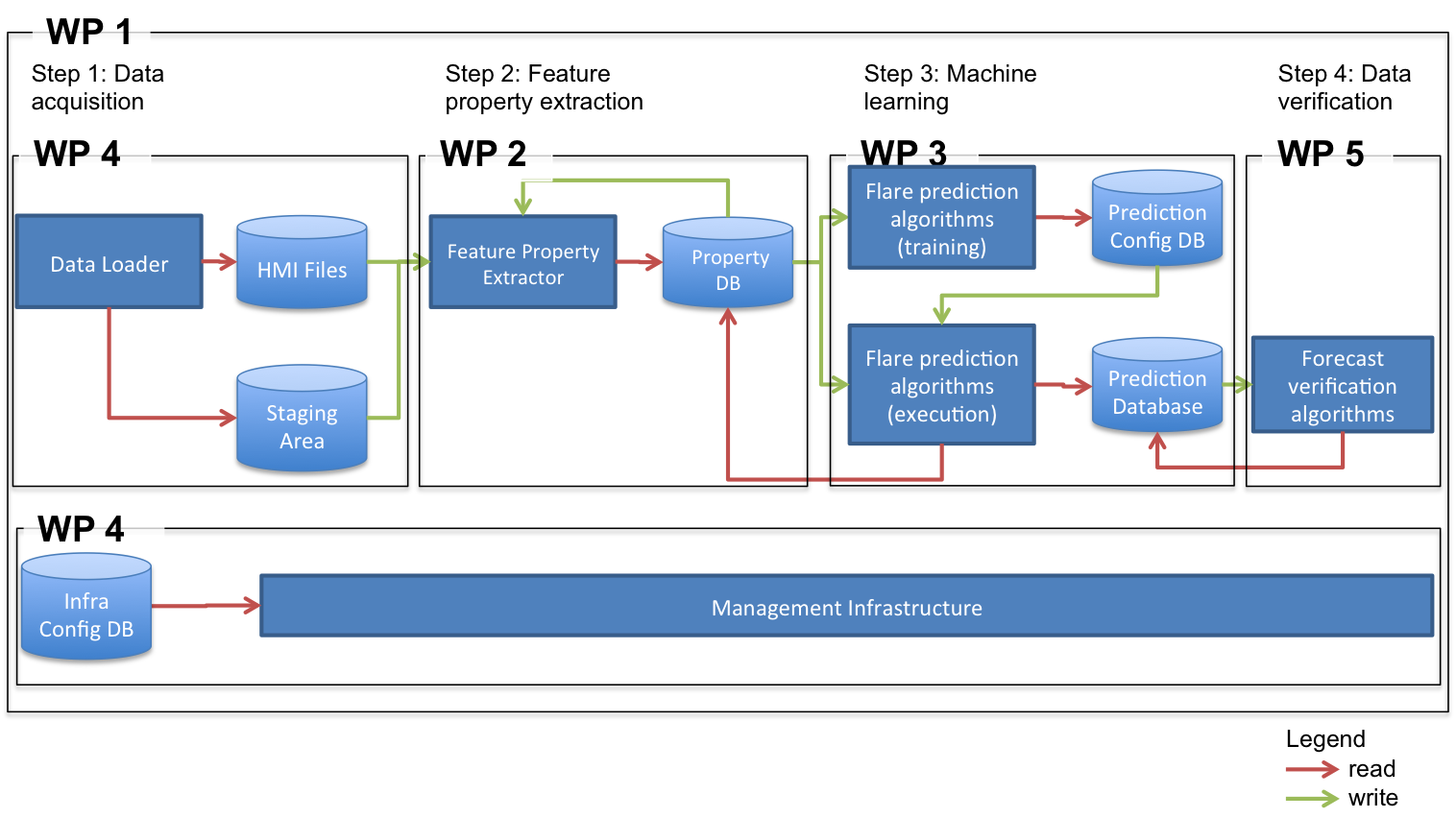 Figure 2: Revised version of the initial FLARECAST architecture. The Management Infrastructure and step 1 are under the responsibility of WP4, step 2 will be managed by WP2, Step 3 by WP3 and Step 4 by WP5.