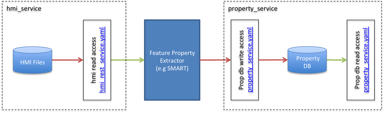 The database symbols in the diagram denote individual parts of the data model. They will not necessarily be implemented as individual physical databases. Each database part will define a common interface to read, create, update and delete data. The read methods include a query language to do simple queries. Figure xxx illustrates this process for an exemplatory feature property extraction algorithm (SMART). The actual interfaces are further detailed in the Data model deliverable (ref).
