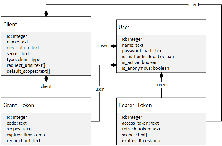 A last missing fragment is the database schema which persistently stores the users, clients and tokens referred above: