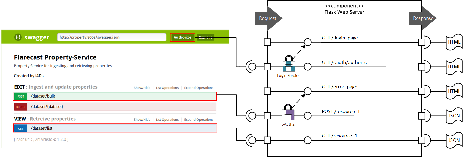 The above workflows are slightly simplified as the web-based user interfaces (UIs) and the REST interfaces, both services in terms of Flarecast, are separated. Hereby, the UIs represent clients, in terms of oAuth2, which use access tokens to access the protected REST resources, e.g. from the property service. Note as Swagger as such represents a oAuth2-secured REST interface while Swagger UI is only a graphical interface, not holding any resources itself.