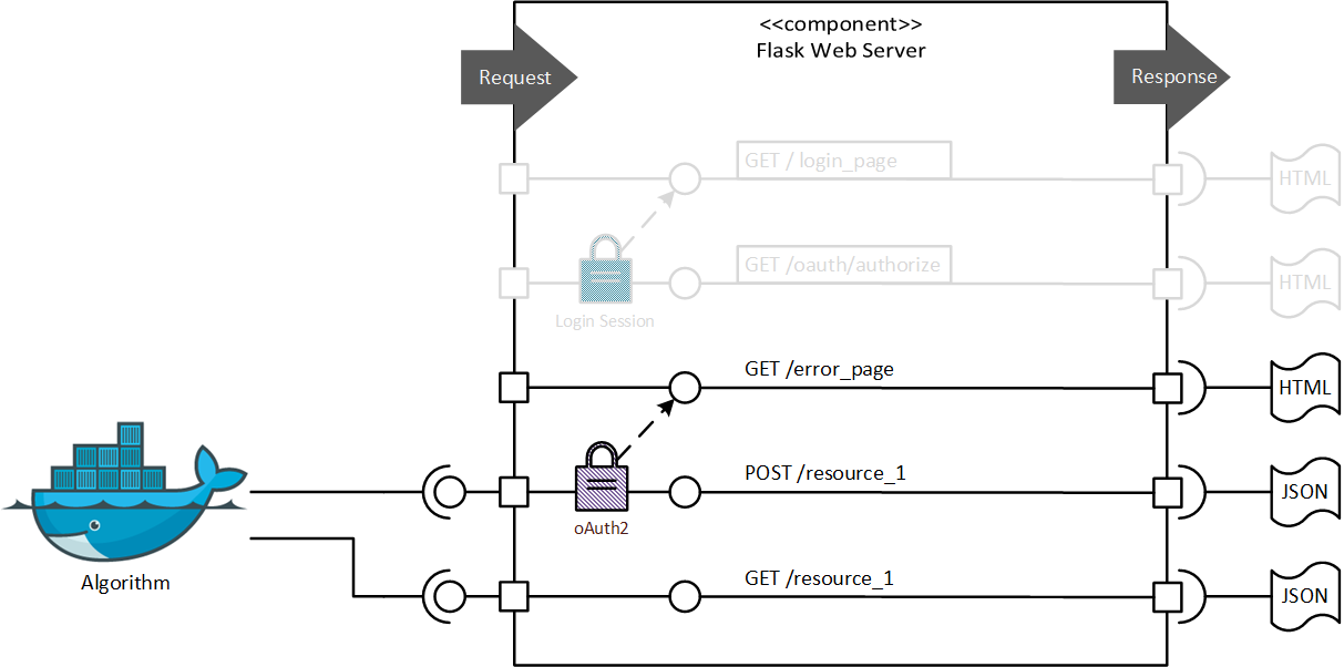 Request Description Response GET /oauth/authorize The end-user requests an access token for the Swagger UI which then can access secured resources. If the end-user holds a valid session ID he is redirected to an authorization page from the oAuth2 server where he can grant Swagger UI to request an access token (using the 'authorization code' grant type). Otherwise, the user is redirected to a login form where he needs to authenticate himself before accessing the authorization page. GET /resource_1 The end-user requests a non-secured resource from the Swagger UI. The Swagger UI response with the requested JSON object, without requiring any authentication. POST /resource_1 The end-user requests a secured resource from the Swagger UI. The Swagger UI response either with the requested JSON object, given a valid access token, or with an error page. Algorithms within a Docker container
