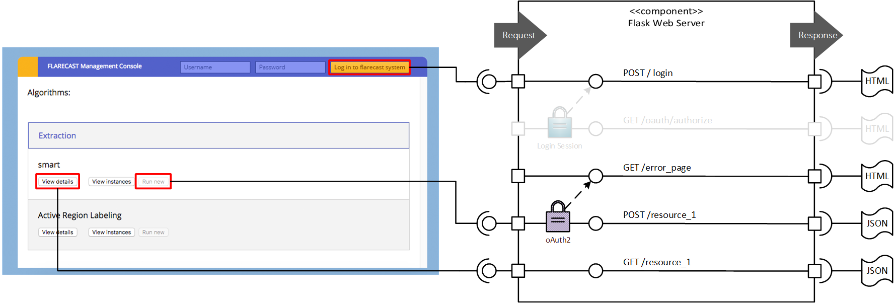 By the above section we described the workflows of a session login and oAuth2 authentication. The concrete implementation is given by two Flask-add-ons which are built on the top of our web servers used within the Flarecast infrastructure.