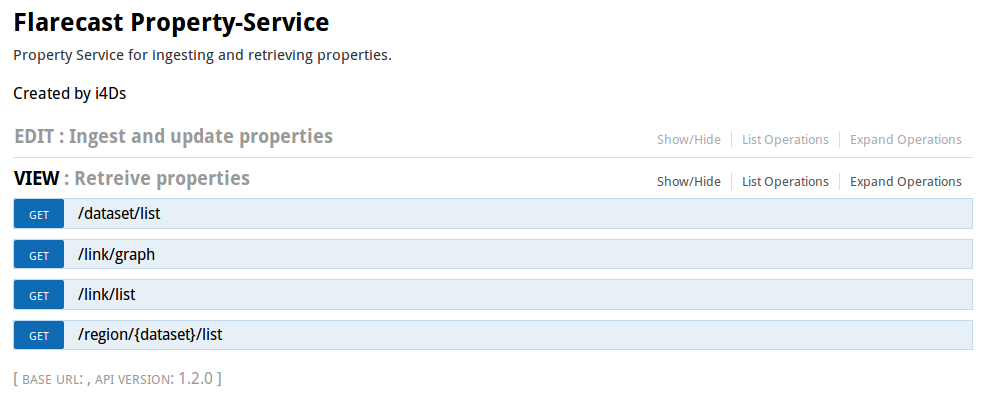 The property service represents a web interface which allows to request, insert and modify property data from the database. Operations are performed by sending URL requests, whereas each operation is well defined as a so called route. The property service comes along with a graphical user interface at http://localhost:8002/ui/ which provides visual access to all available routes. Hereby, all routes involving the request of data are enlisted under the View section.