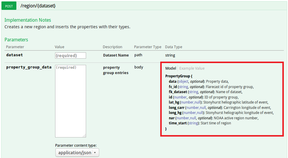 When we look at the definition of the route /region/{dataset} we can find three parameters of three different types (path, body, query):